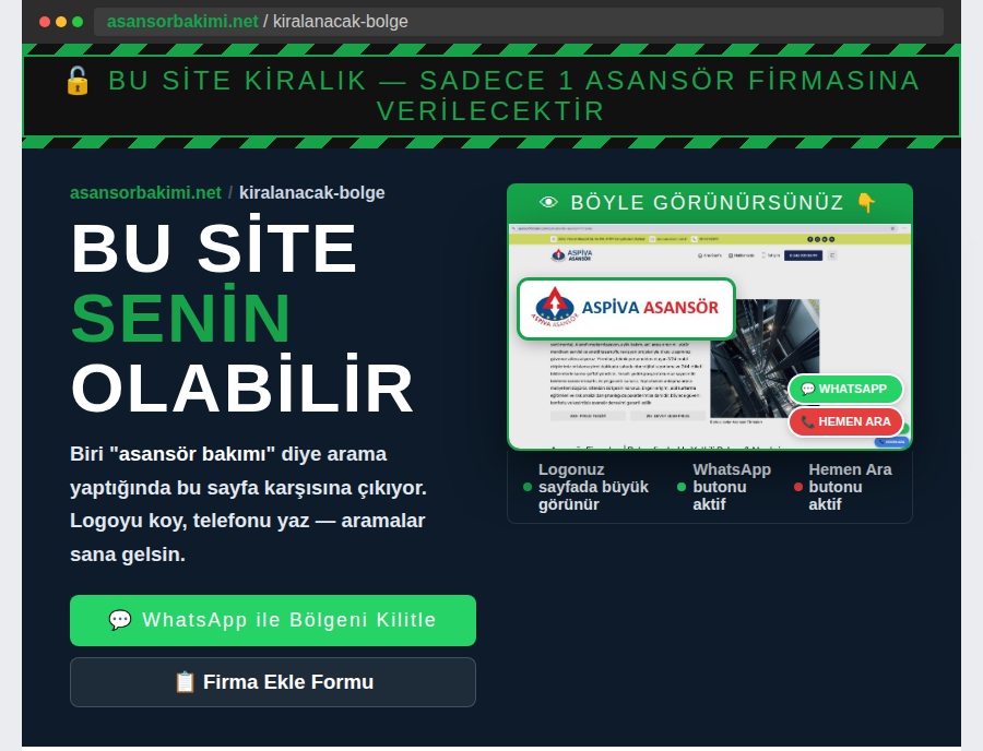 Google’da “Umraniye Asansor Firmalari” yazan musteri bizim sayfamizi goruyor. Siz o sayfayi kiralayin — telefon direkt sizi arasin. Bolge kiralandiginda sayfada sadece siz gorununursunuz.